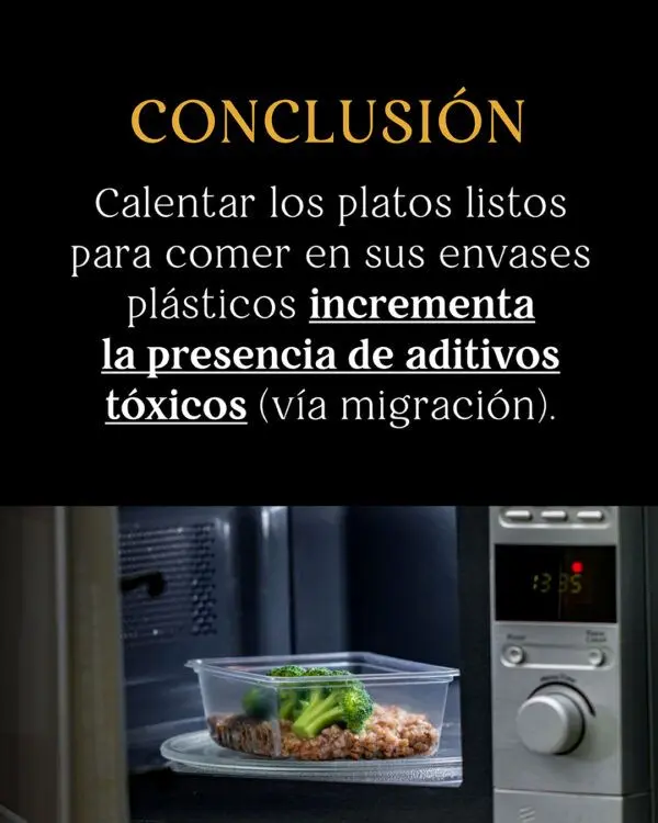 Conclusión directa: calentar platos listos para comer en sus envases plásticos incrementa la presencia de aditivos tóxicos en el alimento por migración. Este hallazgo desmonta la tranquilidad que ofrece un envase oficial con sello o pictograma de “apto para microondas”.